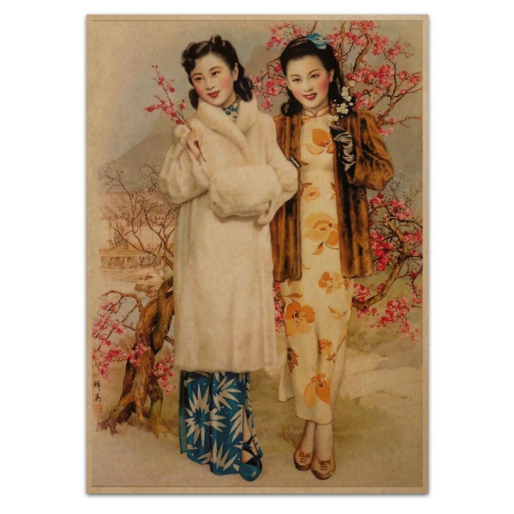 Two Girls in Furs Poster Vintage Reproduction Print Shanghai Lady Chinese Ad Art