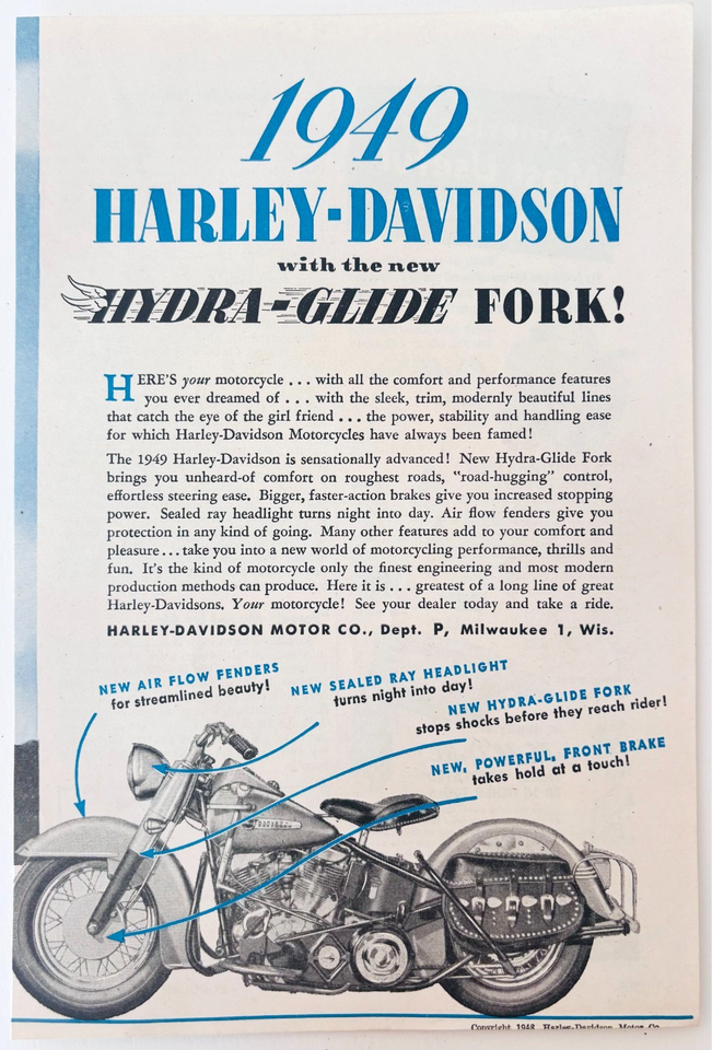 1949 Harley Davidson Motorcycle Advertisement Hydra Glide Fork Vintage F15U1