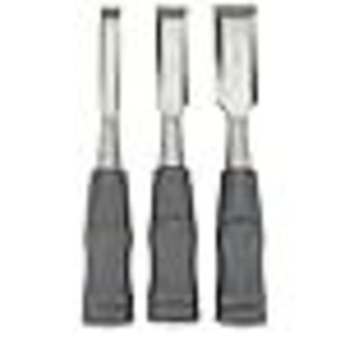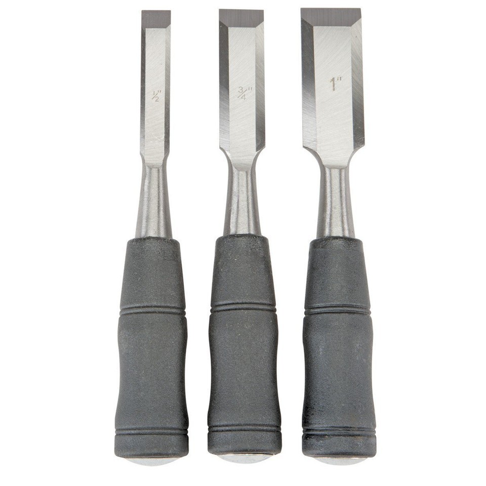 Product description: Windsor Design 3 Piece Wood Chisel Set with plastic guards. Details include: extended shaft handles (plastic), 1/2 inch, 3/4 inch, and 1 inch chisels. Dimensions: Chisel: 7-5/8" L by 1-1/4" diameter Handle: 3-3/8"L by 1-1/4" diameter Struck Face: 7/8" diameter