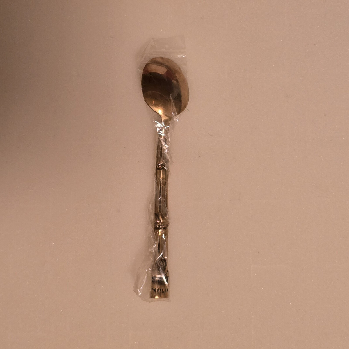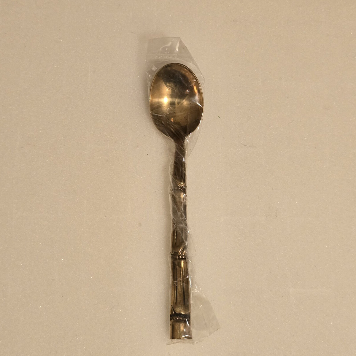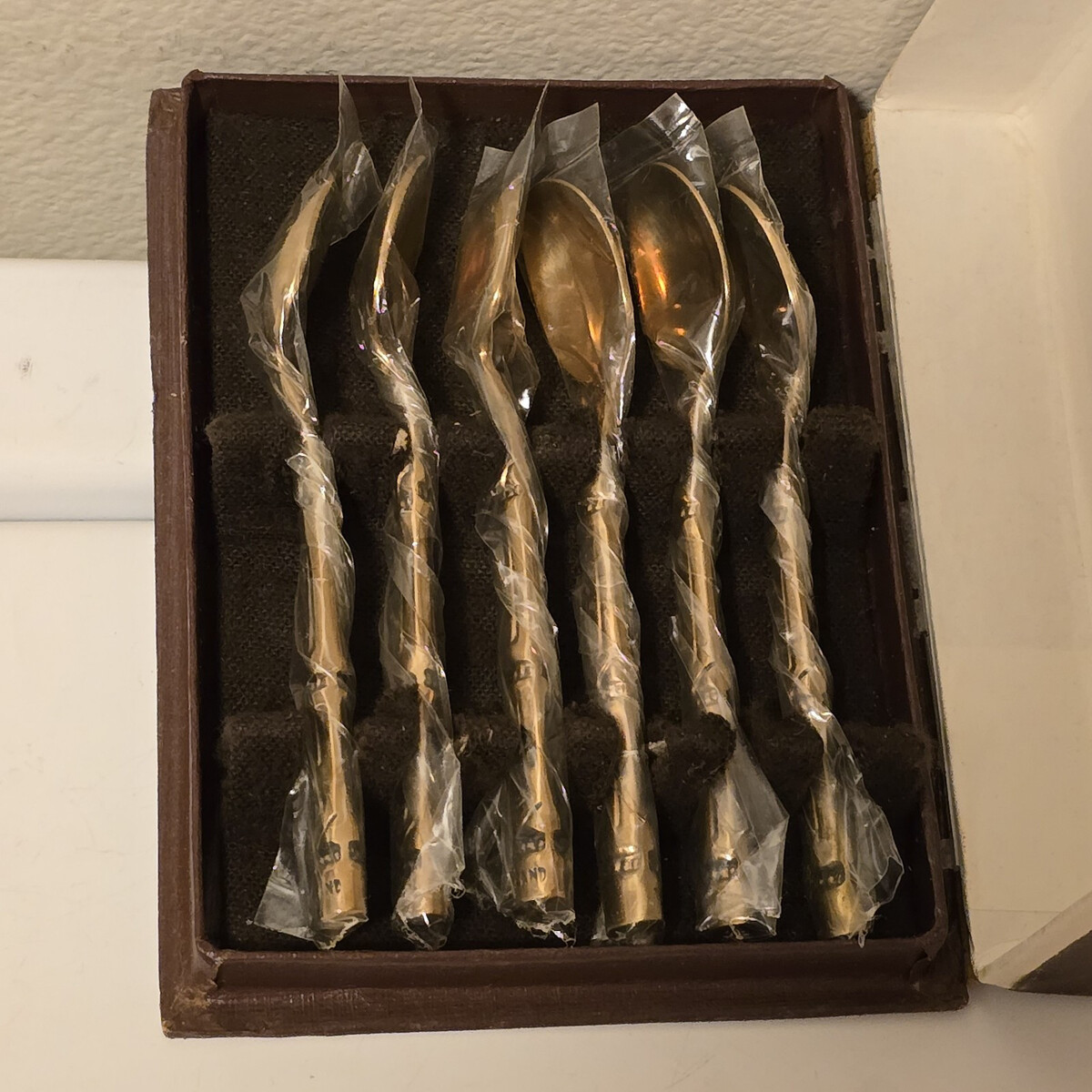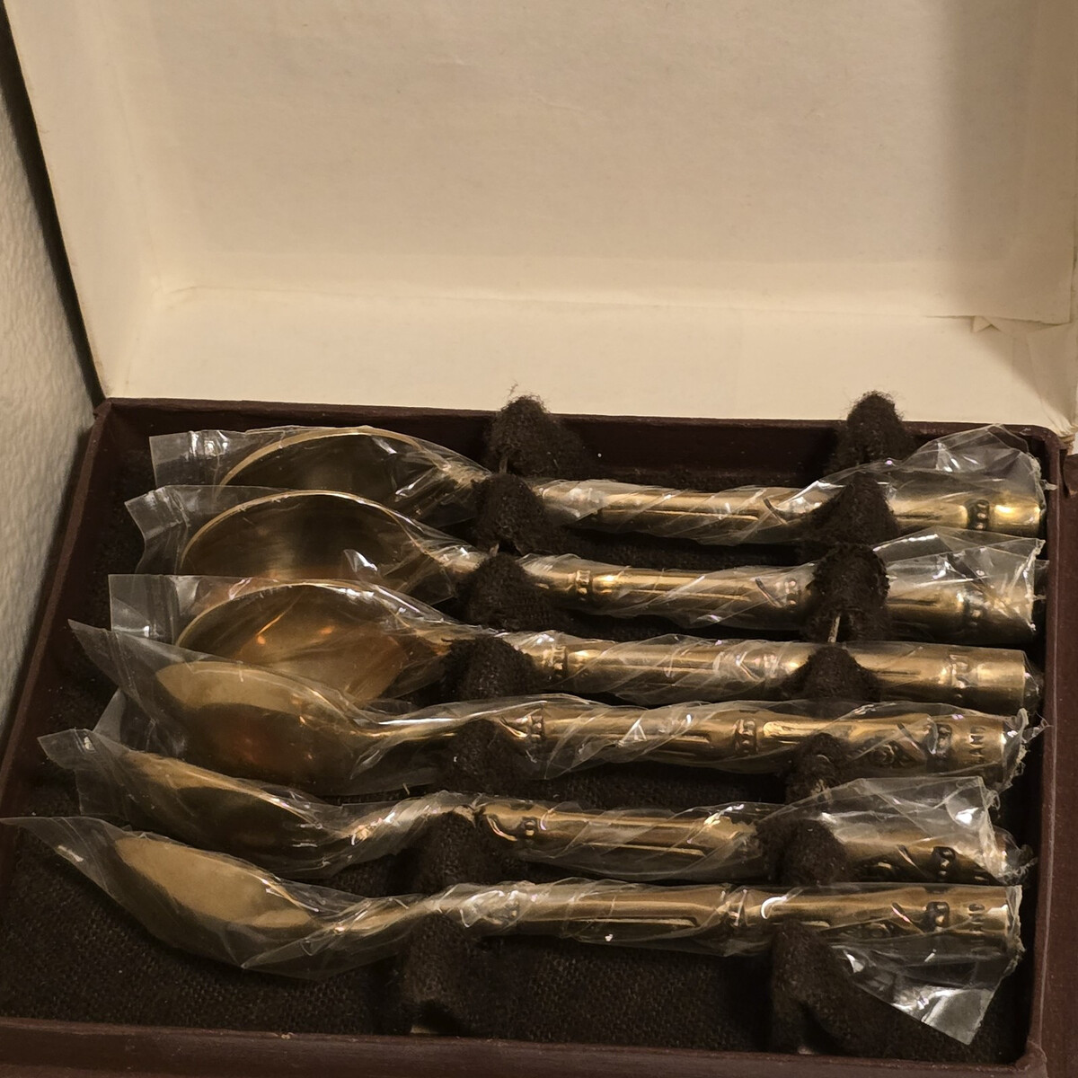 New in Open Box Vintage Bamboo Design Nickel Brass Gold Tone Demitasse Spoons - Made in Thailand - Box of 6. Sealed individually. These measure approximately 4.5" long.