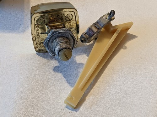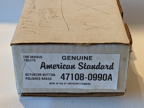 Up for sale is a used in box American Standard Push Button Tank Lever Polished Brass Finish Handle Plastic Arm.