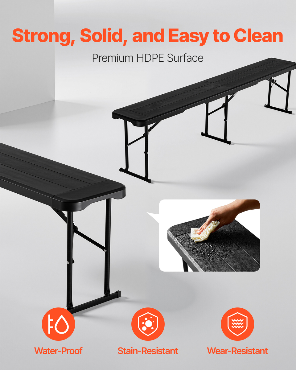 VEVOR Plastic Folding Bench, 6 ft Bench, HDPE Seat, 2 Pack, 2 Carry Bags, Black