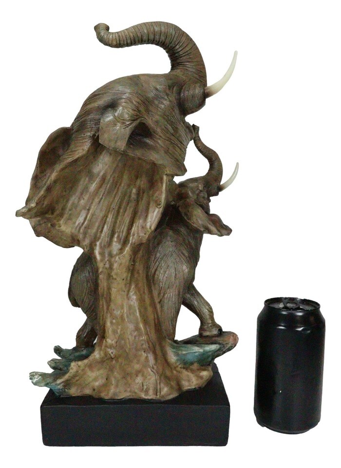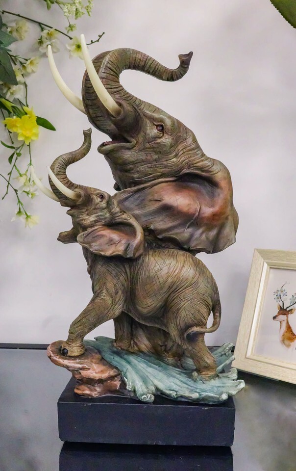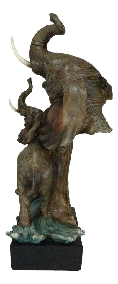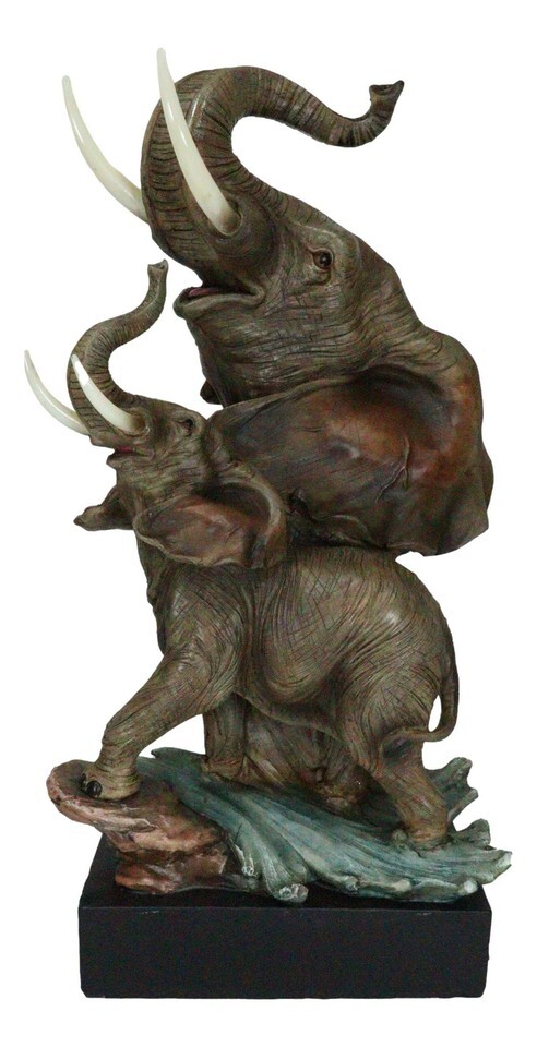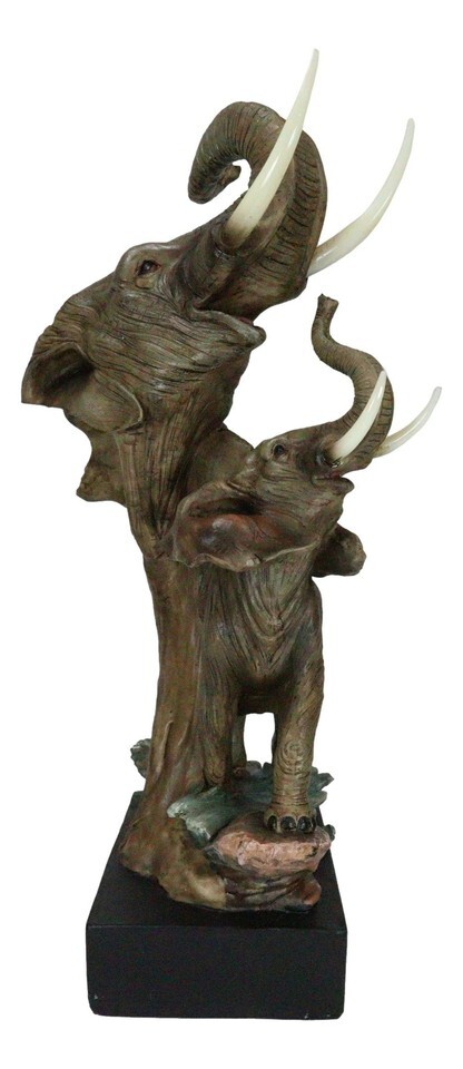 ? This exotic sculpture is symbolic of the elephant's power and might, showcasing the bust of a tusked elephant with its trunk up. Beneath the elephant head is a full bodied elephant on a forest trail trumpeting as it marches down the path. The sculpture is topped off with a black pedestal base to give it a beautiful museum gallery look.