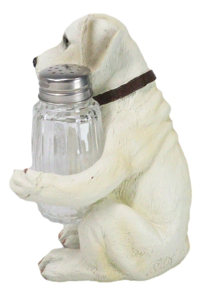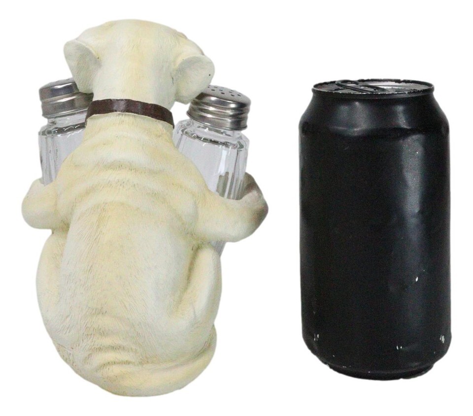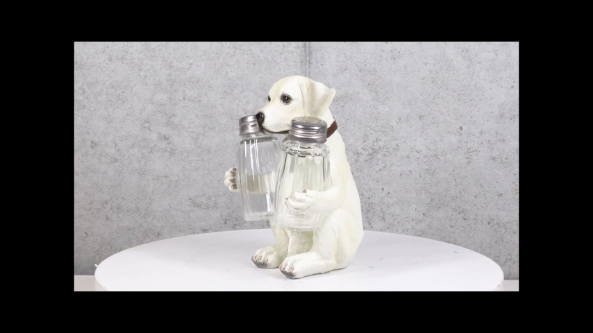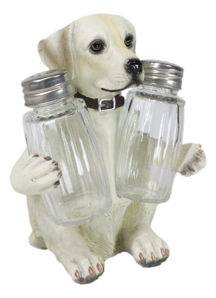 ? This Fawn Labrador Puppy Salt And Pepper Shaker set is made of high quality polyresin, hand painted and polished. They are equipped with two glass shakers as pictured without the condiments.