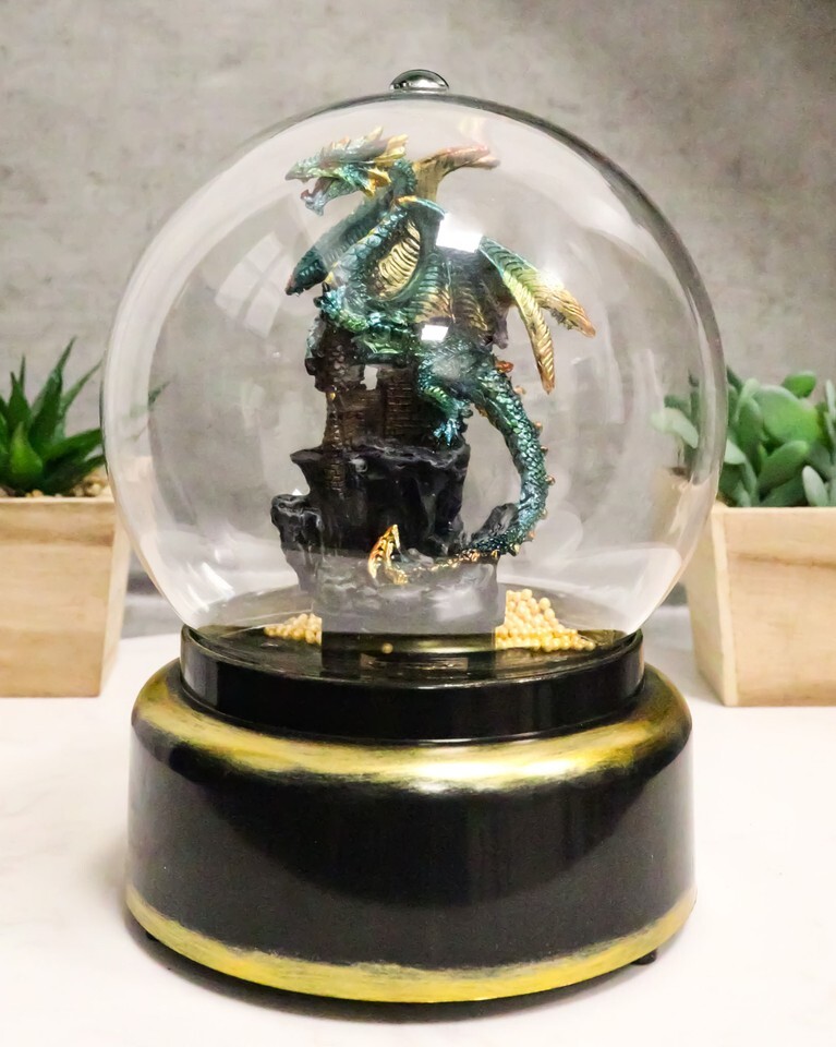 Golden Green Dragon On Castle Mountain Musical LED Air Powered Glitter Globe