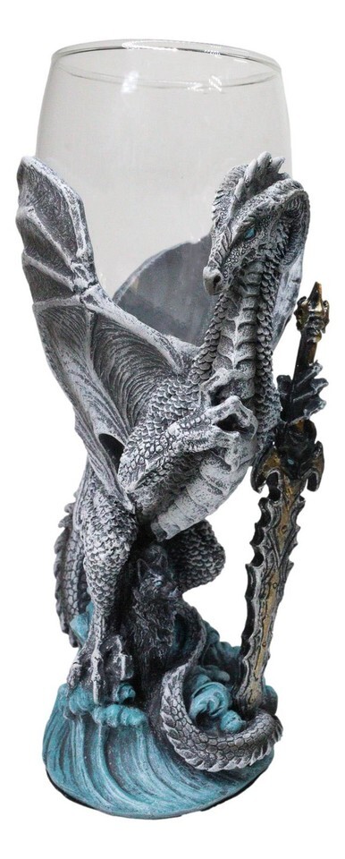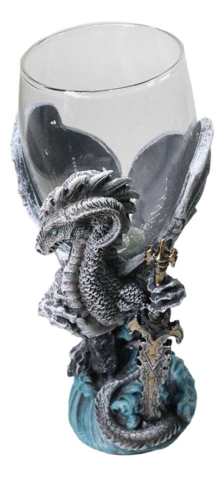 ? Raise a toast to the arcane with this Elemental Dragon Blade Sword Glass Wine Goblet Chalice Cup. Wrapped in the coiled guardianship of a fierce elemental dragon, the stem showcases sculpted blades and ornate elemental detailing, turning every sip into a ritual worthy of ancient legends. The clear glass cup crowns the piece, catching light like a spell crystal poised for enchantment.