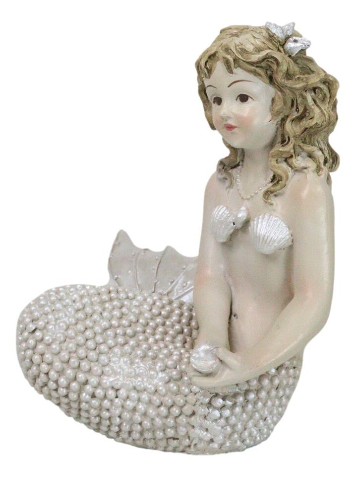? Enhance your decor with the whimsical charm of our Mergirl Coraline with Pearl Beaded Tail Figurine. This delightful piece features Coraline, a lovely mermaid adorned with a pearl-beaded tail, sitting gracefully and exuding an aura of oceanic enchantment. Perfect for coastal and nautical-themed interiors, this figurine adds a touch of elegance and fantasy to any space. Whether placed on a shelf, desk, or mantle, it serves as a captivating focal point.
