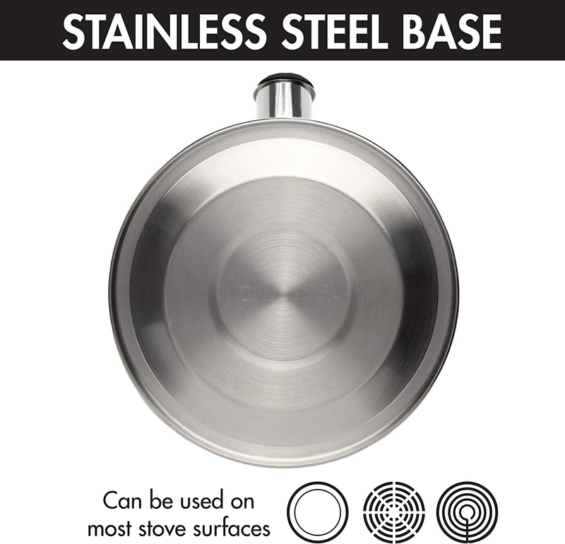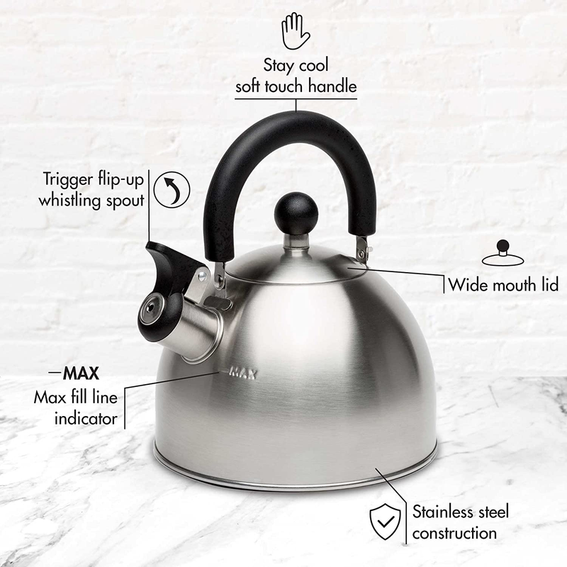 Add style and function to your kitchen with this attractive stovetop water kettle from Primula. Like classic whistling tea kettles, the Stewart emits a pleasant whistle to alert you that your water is boiling. The Stewart Whistling Kettle is sturdily designed and constructed, and sports a timeless design to suit any decor from traditional to modern. The spout opens easily with just a quick flip. The handle features a stay cool coating that protects your hand from the heat, and folds down for easy storage in tight spaces. The classic shape and brushed stainless steel finish make this kettle a gorgeous addition to your kitchen.