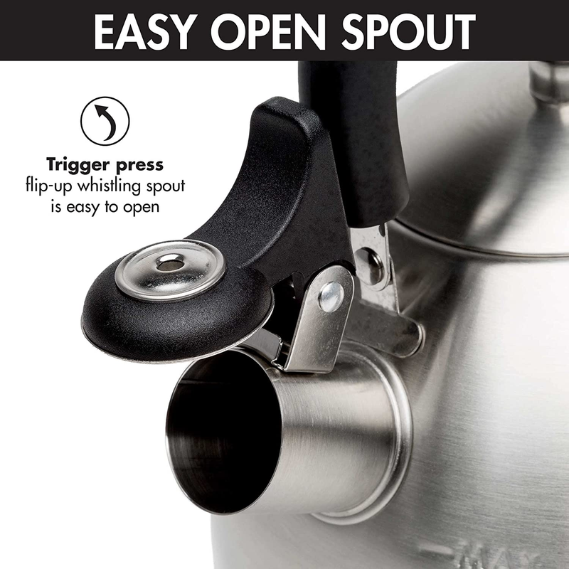 EASY TO USE- This kettle will boil water in no time and features a flip-up whistling spout that easily opens when it?s time to pour.