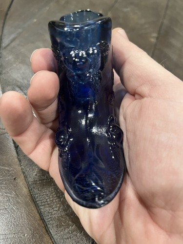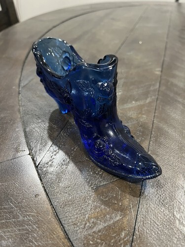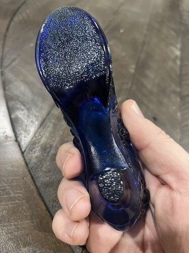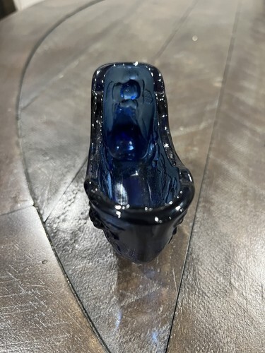 This vintage Fenton glass slipper shoe is a beautiful addition to any collection. The intricate floral pattern and blue color make it a standout piece. Crafted using fused glass production technique, this shoe is a perfect example of art glass. The backstamp is impressed and it was made in the United States. It is a perfect decorative pottery and glassware piece that can be used as a figurine.