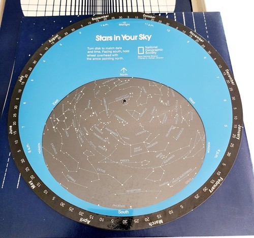 Inside there is a manual for a telescope, a circular Constellation star map and guide, a folder of photo slides with different astronomical objects on them and a very very thin vinyl record which is playable on any record player. The contents of the record are on history, the universe, planets and more