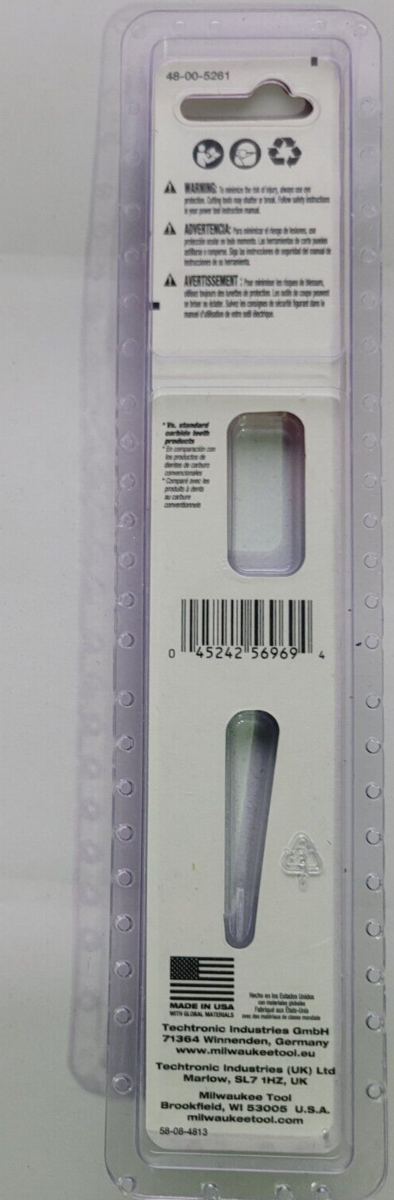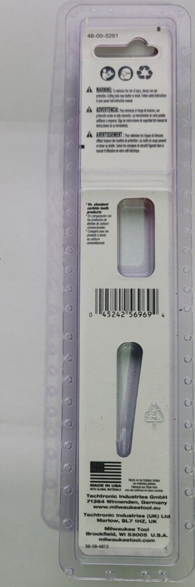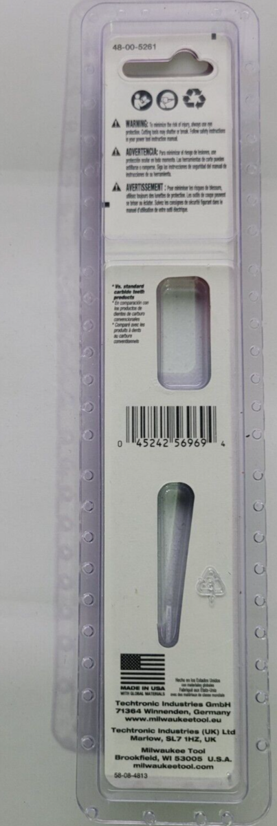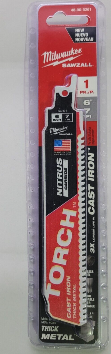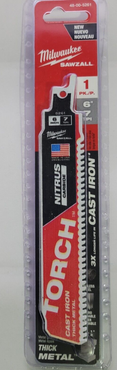 You are Buying Brand New And Factory Sealed Milwaukee 6 in. 8 TPI TORCH Nitrus Carbide Teeth Metal Cutting SAWZALL Reciprocating Saw Blade Model #48-00-5261 .... with 25% more Nitrus Carbide per tooth and a universal tang, The TORCH SAWZALL blade with NITRUS CARBIDE is designed to cut the thickest metals like cast iron and soil pipe. With the unique carbide, it also outperforms standard carbide teeth blades in common thick metals.