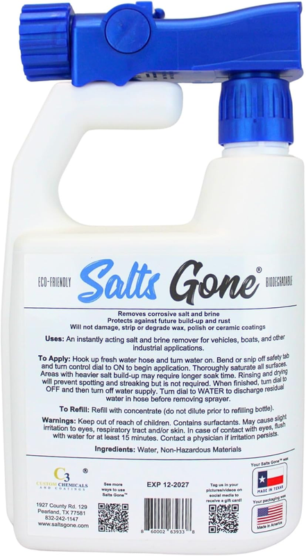 Hook up a standard garden hose and start rinsing with Salts Gone. The 32oz bottle comes full of concentrate and ready to use.