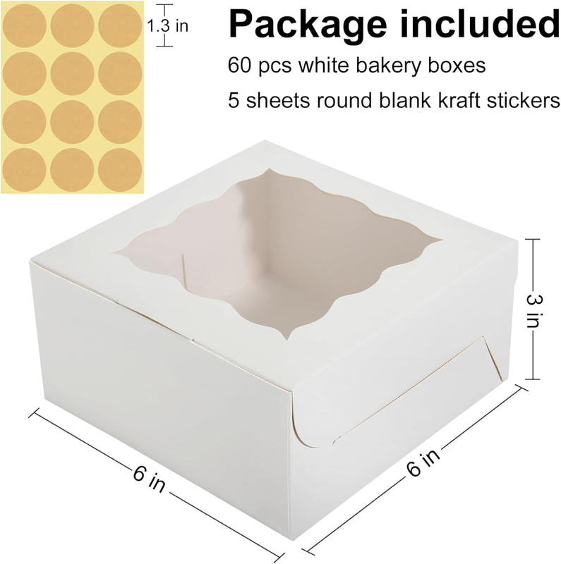 What you get: Comes with 60 pieces white bakery boxes and 60 pieces blank stickers. Each box measures 6 x 6 x 3 inches. Depending on the individual folding method, the size will have the error of 0.2 inches.