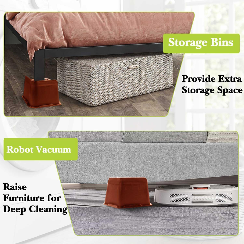??Practical and Versatile Bed Raisers? These bed frame risers not only make it easy for robotic vacuum go under furniture without getting stuck, but also raise furniture for additional storage space. sofa risers 4 inch heavy duty also make it easier for elderly or tall person to get up from the couch and elevate a workbench to bid farewell to back pain, and even lift the head of bed to help nighttime reflux issues.