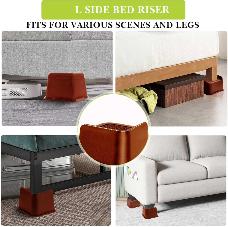 ??L-shaped Lip Risers for Different Furniture legs? The top of 4 inch bed risers is designed with lip on only two sides and plenty of width at the top, which makes the riser easier to match different furniture legs. L-shaped design is more convenient for installation. Simply lift the corner of the furniture and slide the tv riser blocks easily underneath the furniture.