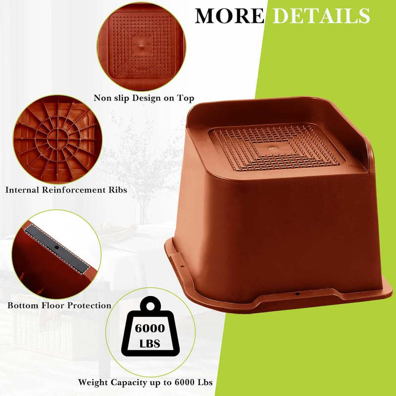 ??Oversized Bed Legs Risers? The 4 inch riser widening and enlarged top surface provides a 4.52x4.52 inch contact area that provides great stability even for heavy furniture. The riser's widened trapezoidal base makes furniture to rest stable and safe on it.