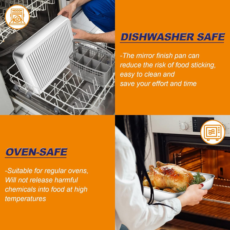 This Baking Pan Set is made of high quality stainless steel without releasing toxic substances into food, safe to use.