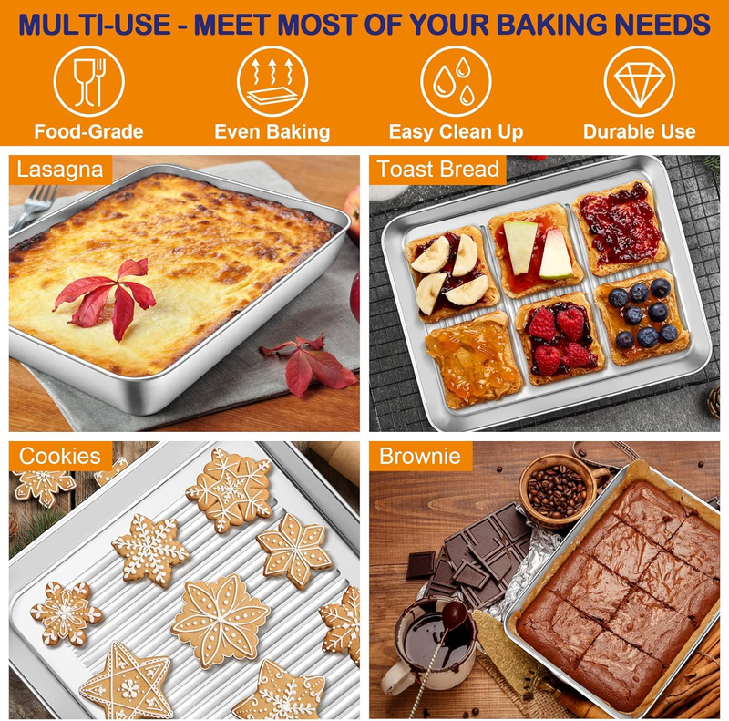 ?MULTI-USE?This stainless steel pan set includes 2 baking pans (12.4 x 9.7 x 1.8 inch), Fits most regular ovens toaster ovens and suitable for your home baking use, They are perfect for making lasagna, cookies, brownie, cake, breads, meats, vegetable etc, Also can be a fruit container and food serving pan, 2-pieces pan could meet different baking needs at the same time, A perfect gift for your family and friend