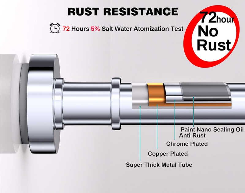 ?Never Rust?The chrome shower curtain rod has three layers of rust resistance. The first layer is copper plating on the metal surface to prevent rust. The second layer is chrome plated. The third layer of high-tech nano anti-rust oil has water repellency, sealing and anti-rust. After the atomization test of 5% saline solution, the shower curtain rod has no rust for 72 hours.