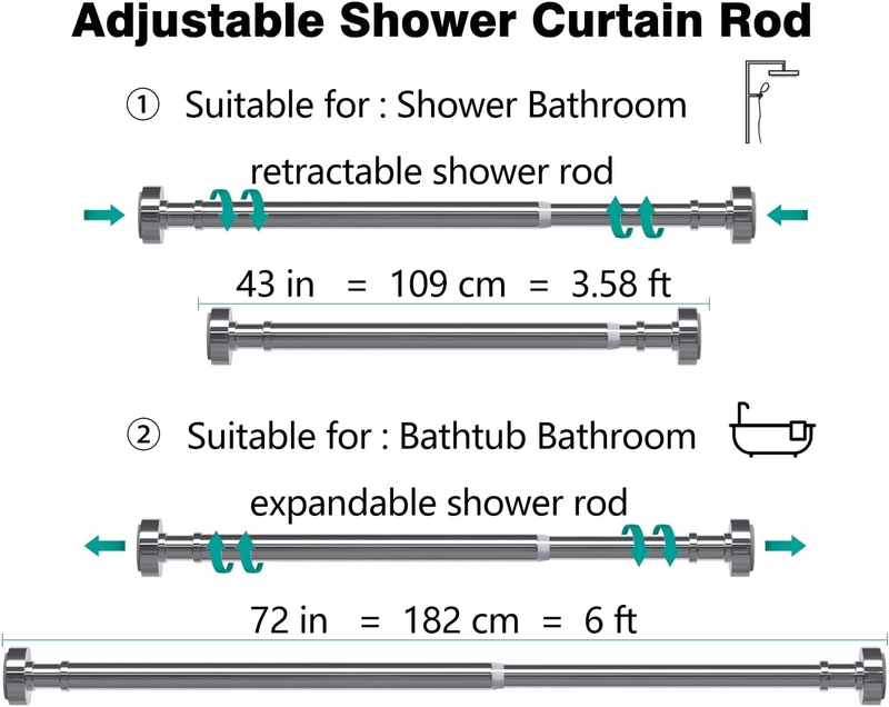 ?Adjustable 43-72 Inches?The chrome extension shower curtain rod can adjust the length of the shower curtain rod by twisting. In shower bathrooms, twist the shower curtain rod to reduce the length to a minimum of 43 inches. In bathtub bathrooms, the length of the shower curtain rod can be extended up to 72 inches.
