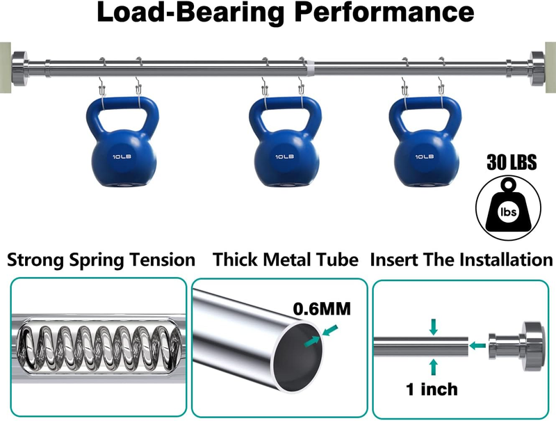 ?Never FALL DOWN?The chrome shower curtain rod has a heavy-duty spring inside, strong tension, the wall of the 1-inch metal tube is 60% thicker than others, and the extra-large non-slip rubber plate is 50% thicker than others, it's diameter is 10%-60% larger than others. The three advantages of the shower curtain rod make it have a strong anti-slip effect, and the tension can be supported up to 30LBS without sliding, surpassing competing products.It's the chrome shower rod never slip.