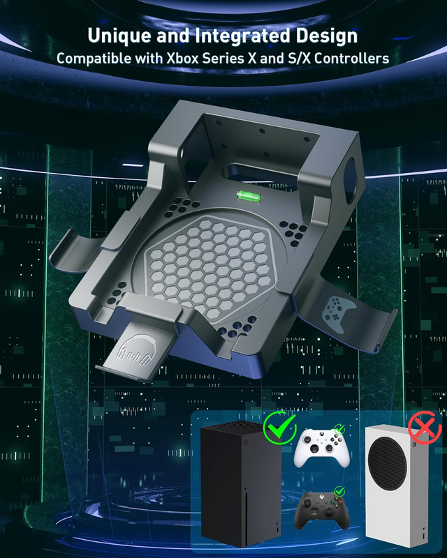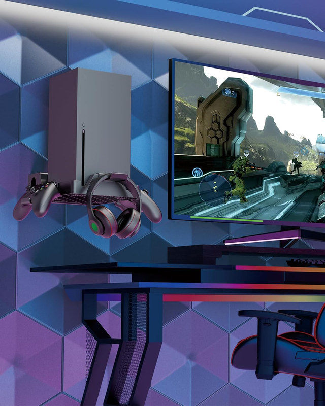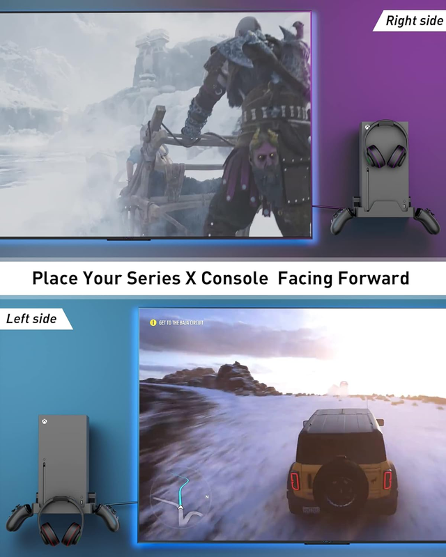 ?Designed for Xbox Series X Storage?If you don't know how to store your console and game accessories. This wall mount is a good choice. This wall mount can place your console to be front facing, and it won't block all ports and disk drive on the console. It can safely store your console, headphone, controllers, game cards and portable hard disk. you can install this wall mount on the left or right side of the TV to give you the best gaming experience on the big screen.