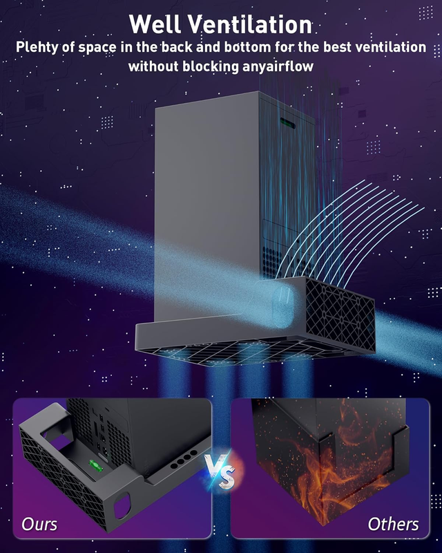 ?Maximize Ventilation Design?There are 24 small ventilation holes on the bottom of this wall mount, which allows the heat from the bottom of the console can be quickly exhausted. And there are also 5 large ventilation holes on the back of this wall mount to prevent console from overheating. What's more, the 5 large ventilation holes ensure that HDMI, USB, Ethernet, and power cables can be passed freely. And the big space on the back also can store your game cards and portable hard disk.
