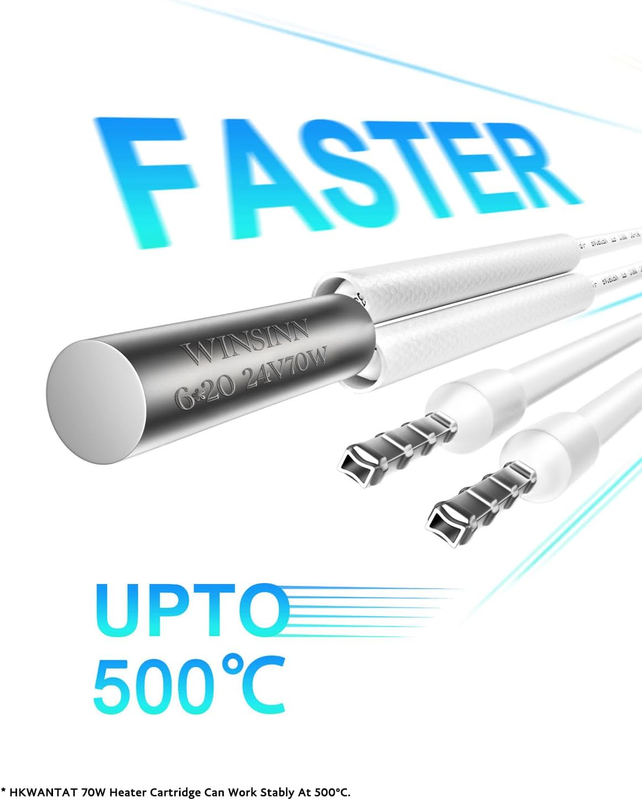 ?Excellent Performance?The Heater Cartridge use Hot Runner Process Design (Armouring Process), which high density, fast and stable heating, long lifetime, bringing you unparalleled experience. So many 3D Printer enthusiasts are full of praise for it, and it will also be your best choice. The working voltage is 24V, which perfectly compatible a various 3D printers on the market. The rated power is 70W, which makes the temperature rise rapidly and works stably at 500C.