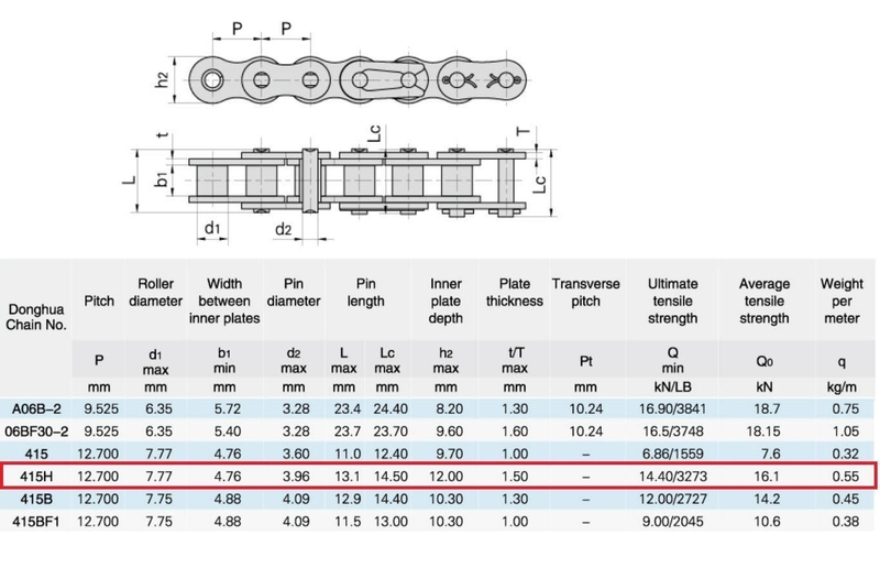 Chain size is 415H x 10FT. Perfect for your 49cc, 60cc, 66cc, and 80cc motorized bike or scooter. This is an actual 415H Chain with a tensile strength of 3620lbs. Chain comes with one of our 415H Connecting Links. Our chains are manufactured to meet the highest quality standards. They are premium quality high alloy chains and they even look great.
