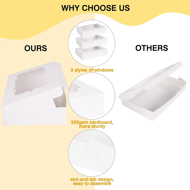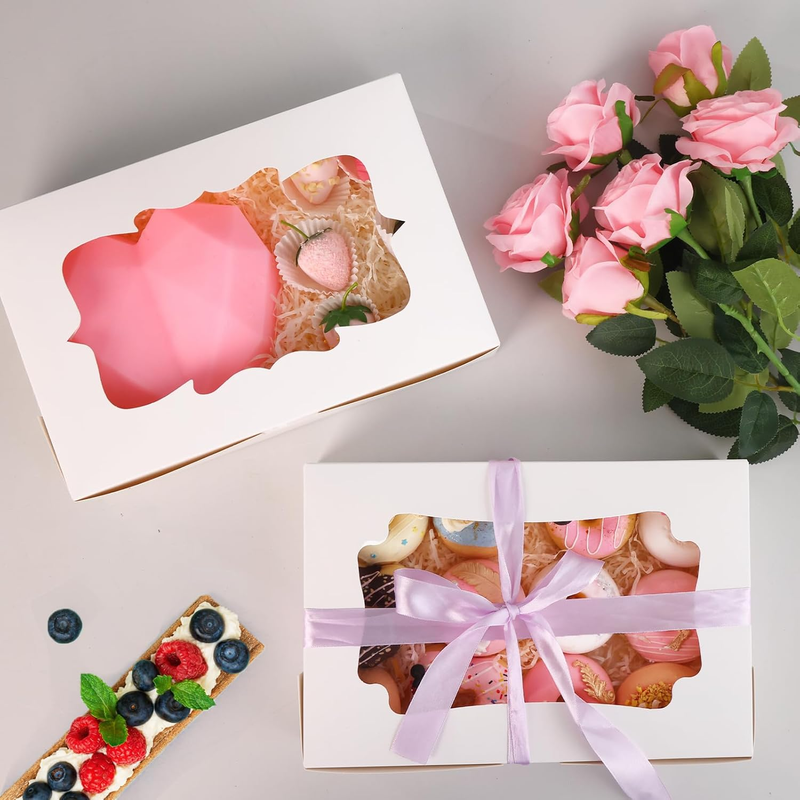 TRANSPARENT WINDOWS: Designed with three clear and beautiful windows to highlight your baked goods. Package delicious desserts in these beautiful bakery boxes and make the recipients happy!