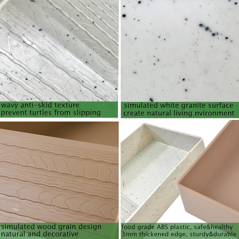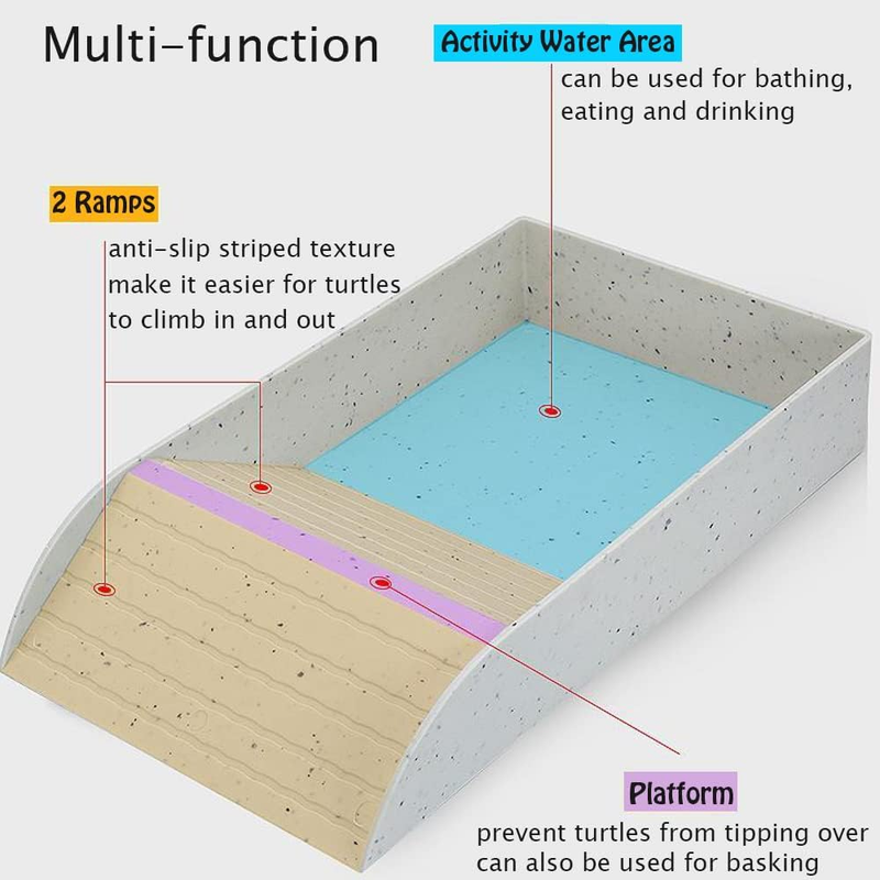 ANTI-SLIP LOW-ENTRY RAMP: The square turtle food bowl has 2 low angle ramps featured non-slip wavy grooves and added striped texture, make it easier for reptiles to climb in and out without dragging in dirt and slipping off when crawling. The top platform of the ramp can prevent turtle tipping over