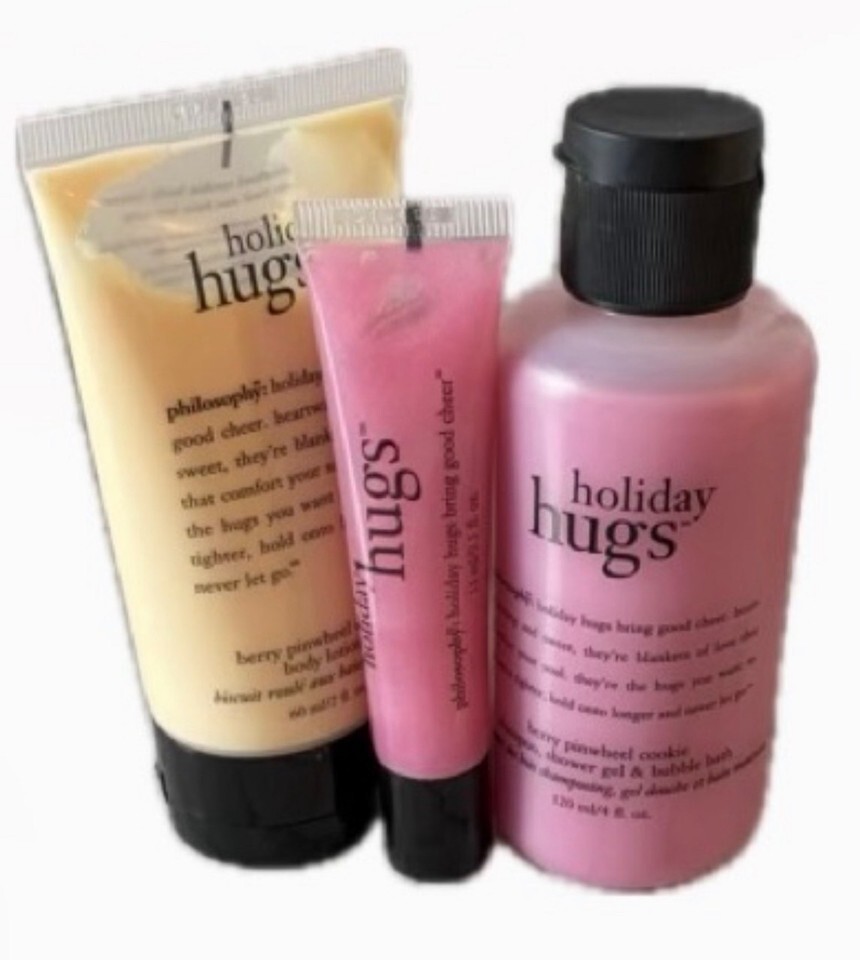 Brand new rare Pre-Coty Philisophy Holiday Hugs Berry Pinwheel scented set containing 3 sealed unused items - lip shine, shampoo/shower gel/bubble bath, and body lotion. No box. All items sealed.