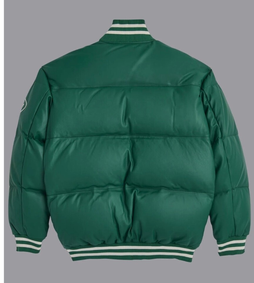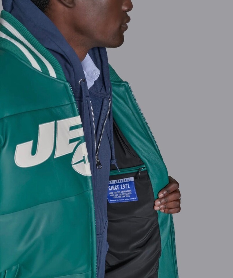 Brand new with tags Starter brand NY Jets green 100% leather puffer bubble jacket as sold at Wilson?s Leather for $595 currently. Down feather fill.