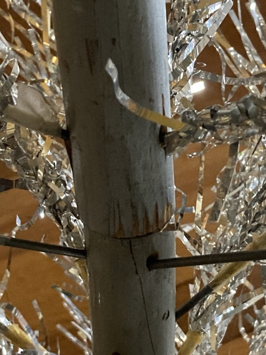 Good condition with normal amount of wear for age. Branches are in good condition, the pole has a few spots where the hole for the branch is chipping around the edge, the base of the pole is wrapped to help it fit in the stand. I think it would be easy to wood fill the chips and re-spray the pole silver if desired. The box , as shown in the photos, is in well worn condition.