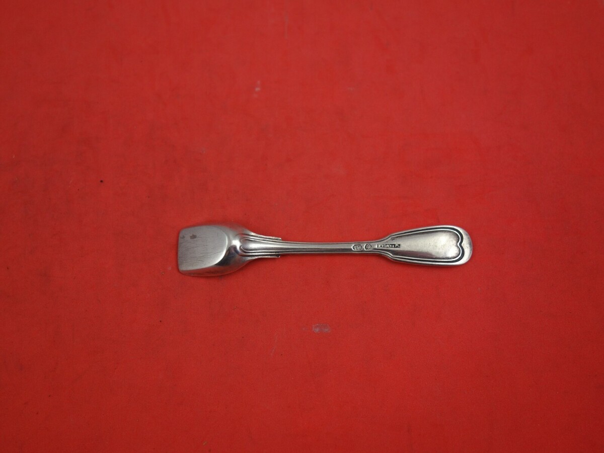.800 German Silver Master Salt Shovel 3 1/2" in the pattern Fiddle Thread. It is monogrammed (monos vary) and is in excellent condition.