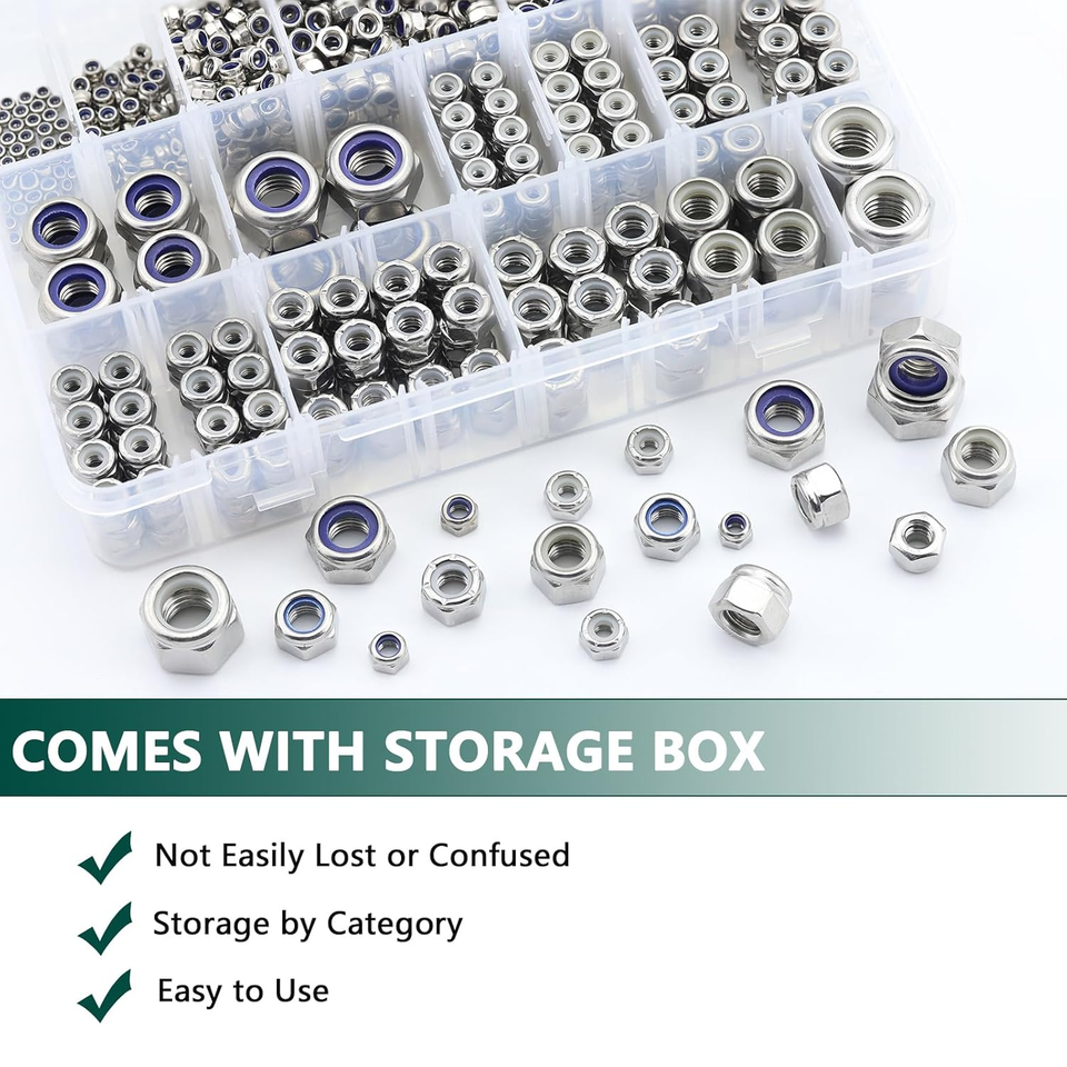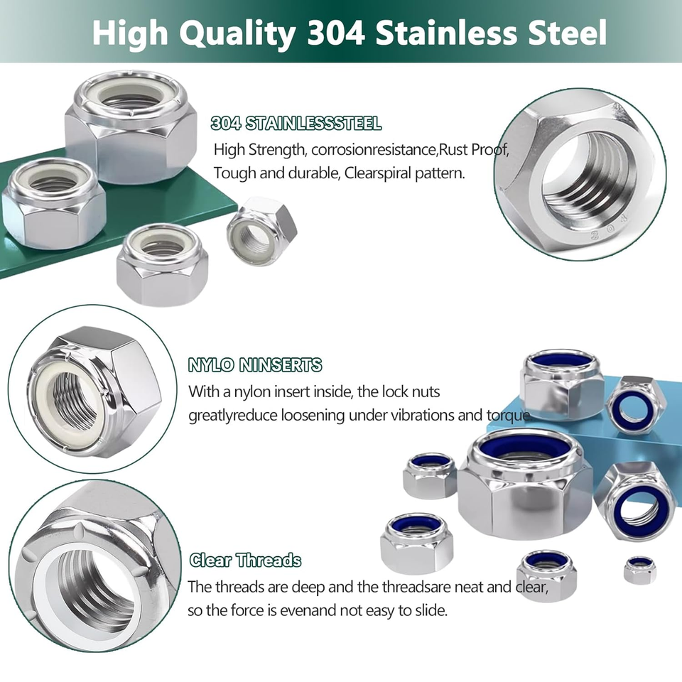 750PCS Metric SAE Nylon Lock Nuts Kit - 304 Stainless Steel, Assorted Sizes