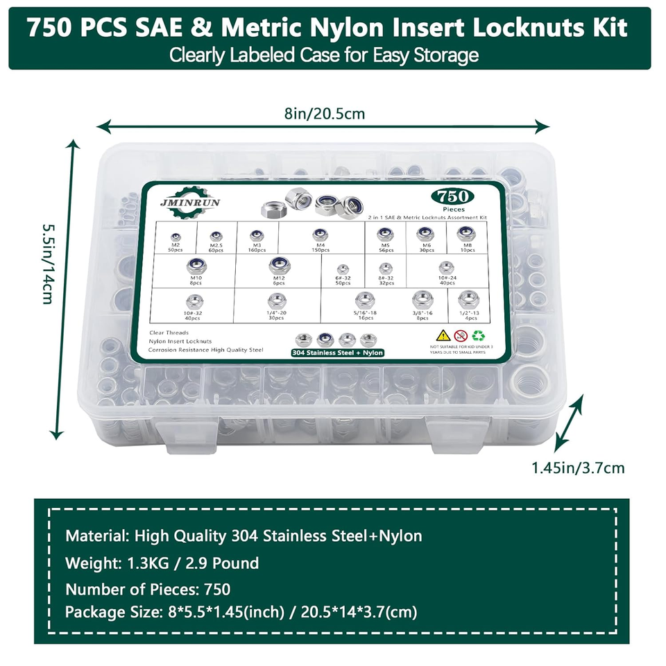 750PCS SAE & Metric Nylon Lock Nuts Kit - 304 SS, Standard Thread, M2-M12, 6#-1/