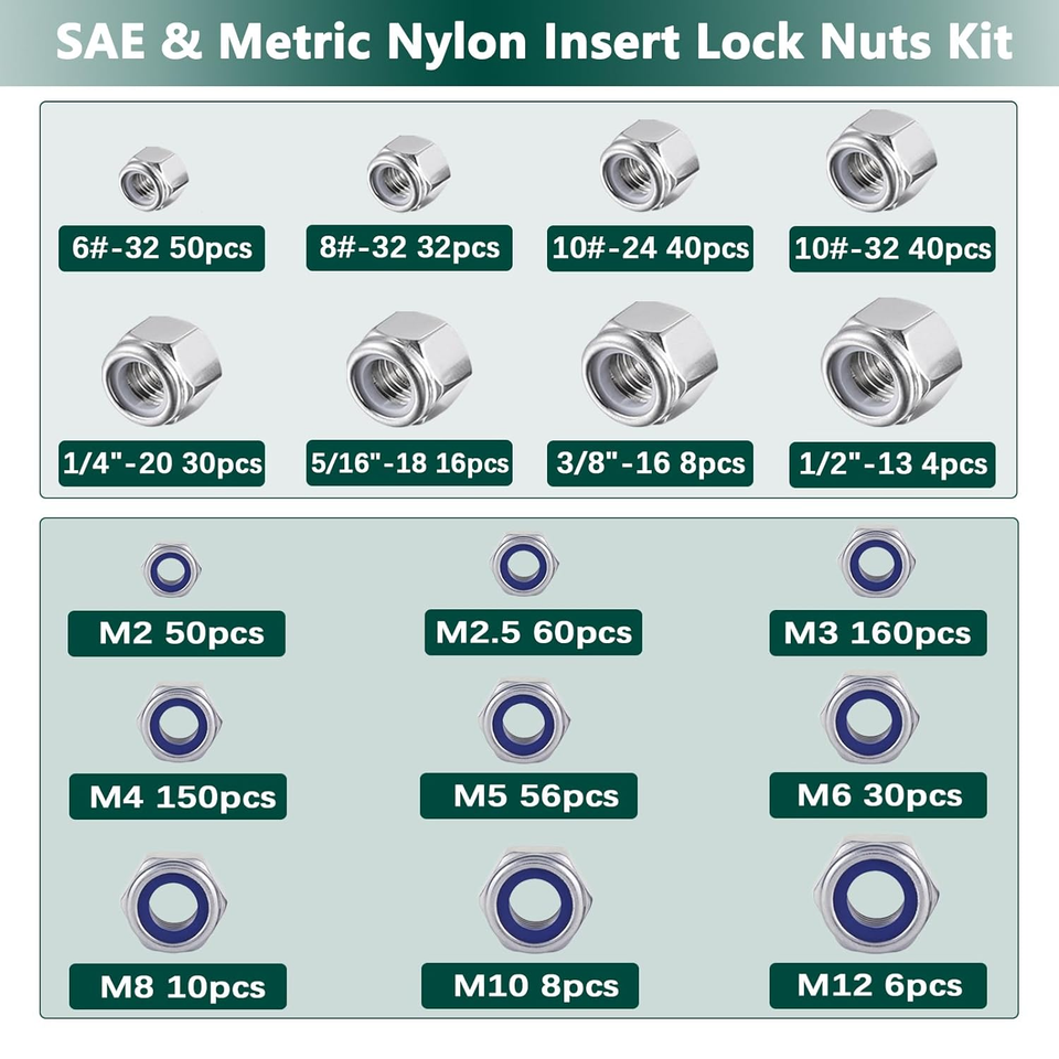 Comprehensive 2-in-1 Kit: Includes 750 lock nuts, with 220 SAE and 530 metric sizes, covering 8 common sizes (6#32 to 1/2"-13 and M2 to M12). Perfect for various fastening needs.