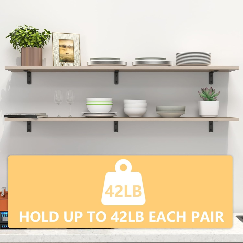 This set of 6 black L brackets is perfect for use in homes, offices, and retail spaces, making it easy to create beautiful and functional shelving solutions.