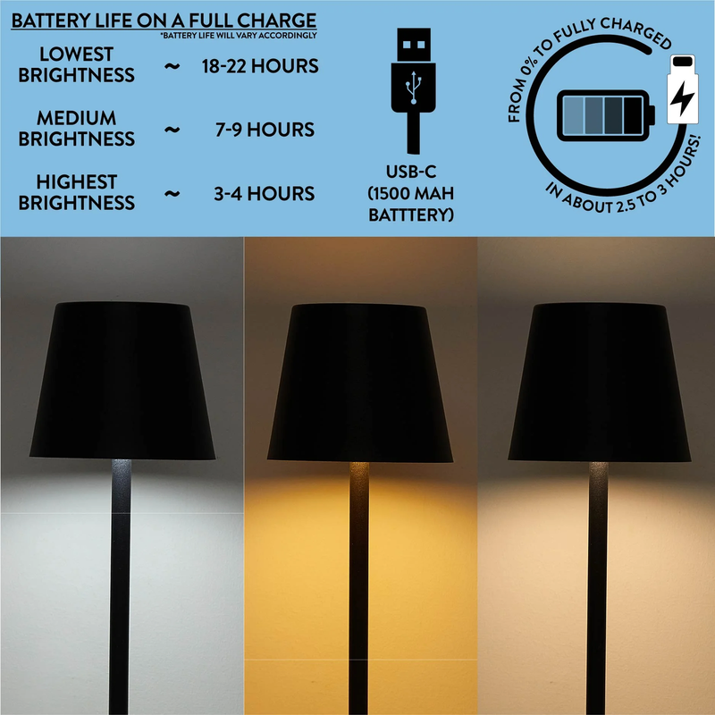 Set of 2 cordless table lamps Black Metal Finish 13" H x 4.25" W Cordless design for indoor outdoor use 3 dimming levels for customized lighting Touch controls for easy operation Rechargeable with included USB cable Portable and lightweight for flexibility Water-resistant for outdoor durability Perfect for patios, bedrooms, or anywhere you need extra light ? without the cords.