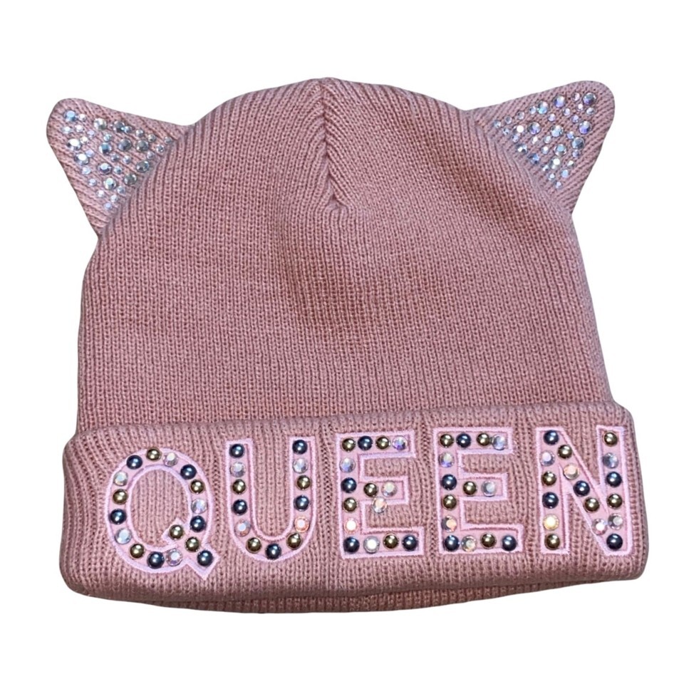 "QUEEN" Studded Pink Cat Ears Girls Slip-On Winter Hat Small (4-7 Years Old) New