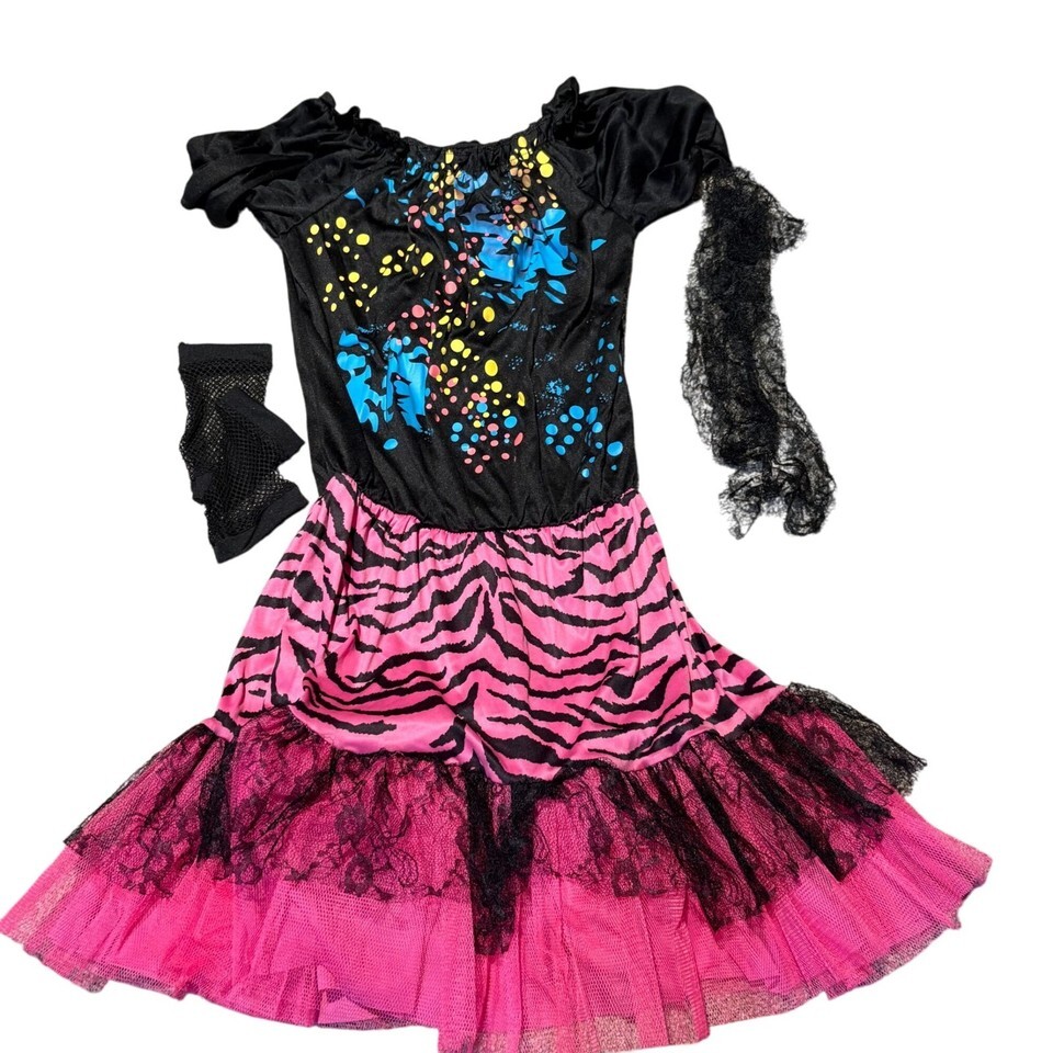 This vibrant 80's Pop Party costume from Spirit offers a nostalgic flair. The set includes a colorful dress, gloves, and hair tie, providing a complete outfit for themed events. Ideal for those seeking a retro look with a lively touch.