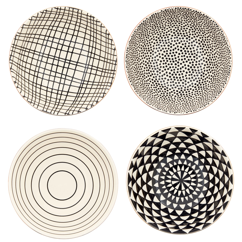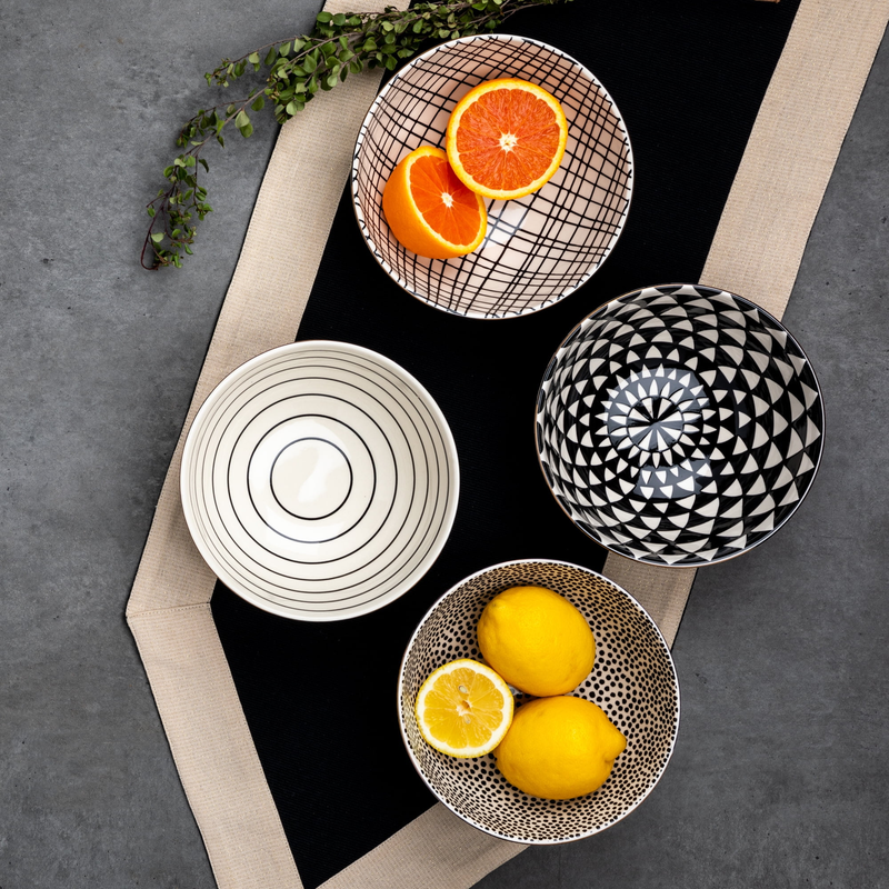 Thyme Table Assorted 4-Piece Ceramic Round Bowls Stylish Design: Black-and-white assorted patterns adds a modern, playful touch Durable Ceramic: Made for both everyday meals and special occasions Ideal for Entertaining: Perfectly sized for salads, pastas, and more Microwave Safe: Convenient for quick reheating Dishwasher Safe: Designed for everyday convenience and effortless cleanup