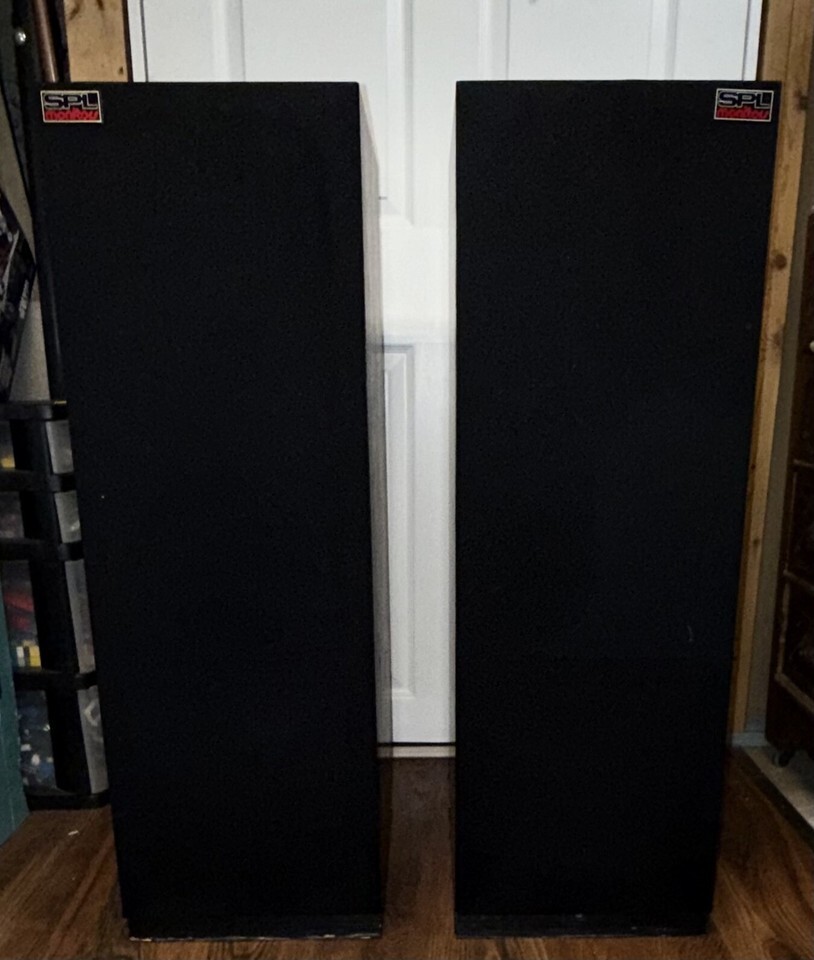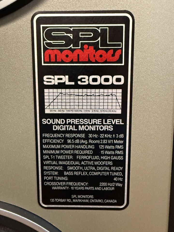 SPL T-1 TWEETER: FERROFLUID, HIGH GAUSS VIRTUAL IMAGE/DUAL ACTIVE WOOFERS RESPONSE: SMOOTH, ULTRA, DIGITAL READY SYSTEM: BASS REFLEX, COMPUTER TUNED, PORT TUNING: 40 Hz