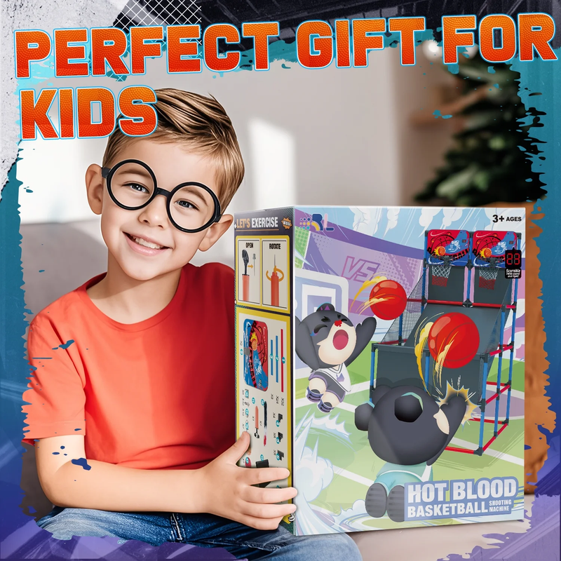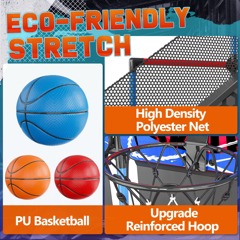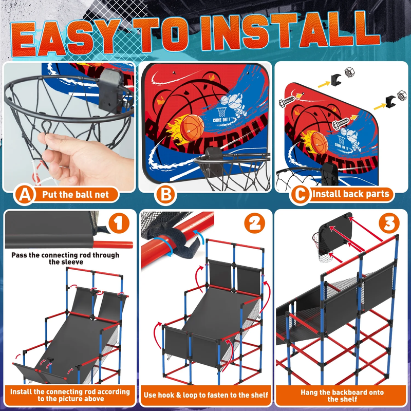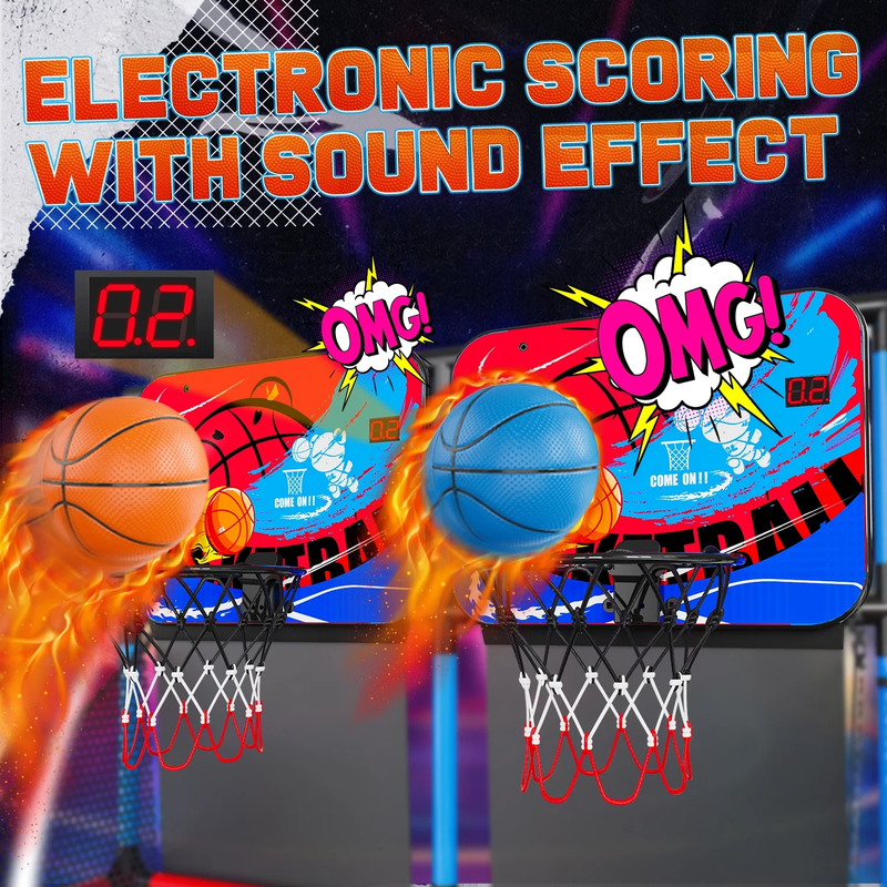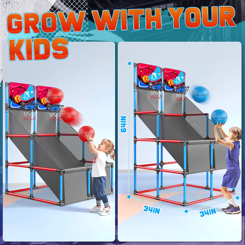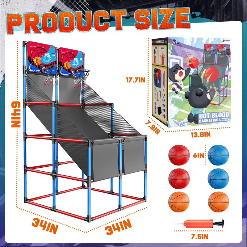?Dual Shot Basketball Game?Equipped with 2 sturdy shatter-proof backboards, 2 10" solid basket rims durable nets and 6 basketballs, this indoor basketball arcade game allows your kids to have a real and exciting basketball competition. ?Digital LED Scoring and Sound?Basketball Hoop Arcade Game Equipped with an infrared sensing system, the mini hoop's LCD shows real-time scores accurately. The arcade can create an exciting and competitive atmosphere to offer a real arcade game experience. ?Adjustable Height?You can adjust the basketball stand height according to age. This indoor basketball arcade game can be placed indoors and outdoors: basement, games room, garage, backyard. ?Rich Accessories?This kids basketball arcade game play set includes 6 x basketballs (6.3" in diameter), 1 x ball pump, 34 x 15.5" tubes, 27 x 9.5" tubes, 36 x connectors, 2 x backboards, 2 x basketball rims nets, 3 x decorative cloth, 2 x tools. Gift Box Dimension: 12.5" x 7.5" x 20.5", Overall Dimension: 35.5" x 35.5" x 55". ?Ideal Gifts for Kids?Follow our straight forward instructions, and within minutes, kids can jump right into their game. Safe, fun and strong. This room basketball hoop is a perfect gift for kids and toddlers for birthdays, Christmas, and Rewards.