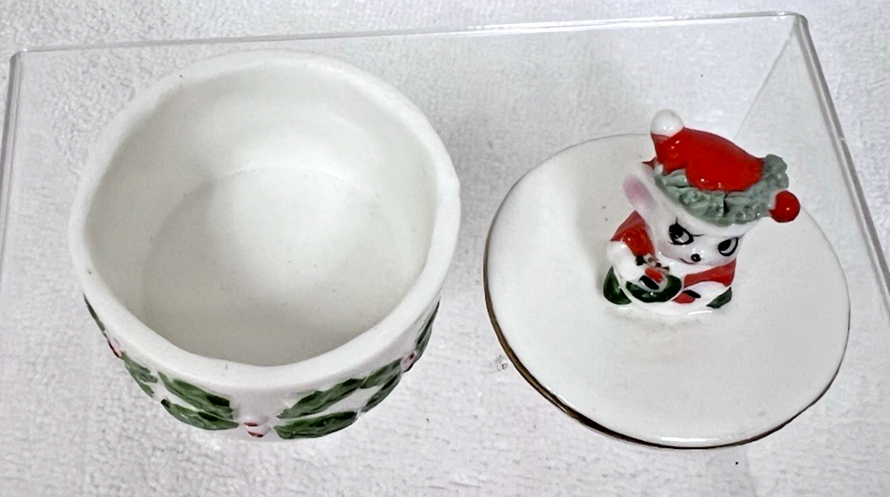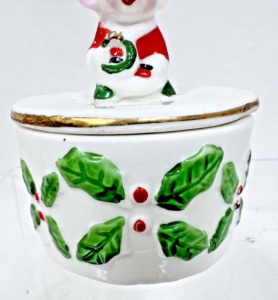Vintage Santa Mouse w Wreath Christmas Trinket Box x Holly Spaghetti Trim In great shape and so cute!! base is 2 1/4 x 1 1/4 tall with lid 2 7/8 inches tall