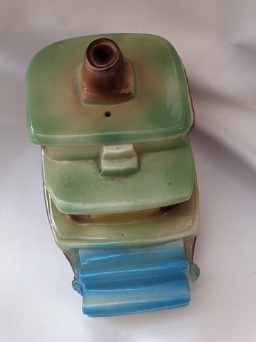Questo e un raro barattolo di biscotti in ceramica americana Bisque a forma di rimorchiatore a poppa con una campana nel coperchio. Il barattolo e alto 9" e ha una lunghezza di 12" e una larghezza di 7". Presenta una bellissima combinazione di colori marrone e verde ed e realizzato utilizzando lo stile e la tecnica di produzione della ceramica artistica. Il barattolo e dotato di un coperchio, che lo rende perfetto per conservare biscotti o altri dolcetti. Non perdere l'occasione di aggiungere questo pezzo unico e affascinante alla tua collezione!