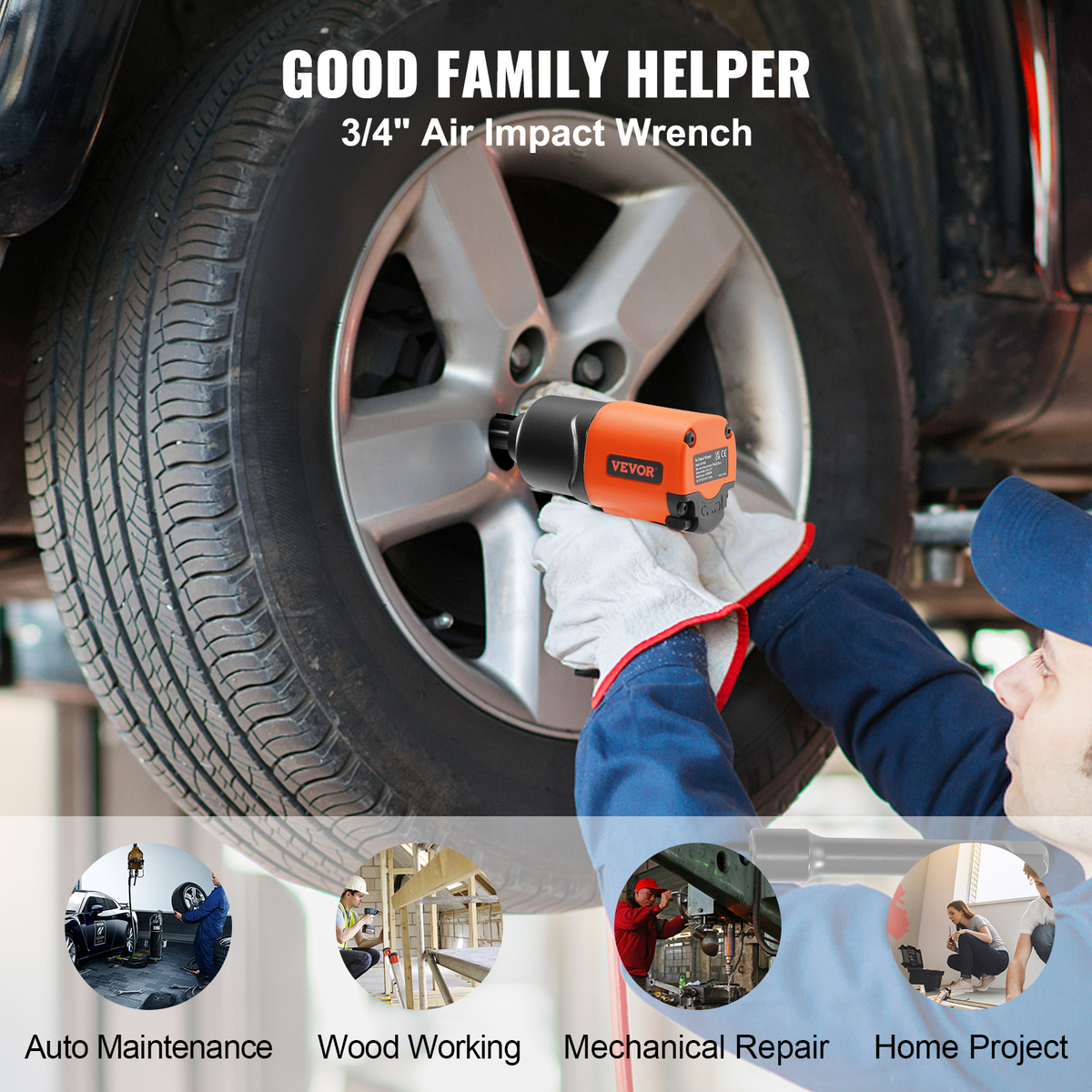 Wide Applications: VEVOR 3/4 inch air impact gun is powerful enough to loosen bolts and nuts, ideal for heavy-duty auto repair like Heavy truck industry and mechanic work; Avg. Air Consumption: 9.5 CFM. Air pressure: 90-120 PSI.
