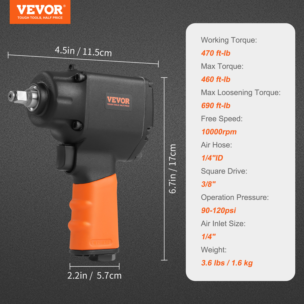Wide Applications: VEVOR 3/8 inch air impact gun is powerful enough to loosen bolts and nuts, ideal for light duty auto repair shops or home repairs and maintenance; Avg. Air Consumption: 4.5 CFM. Air pressure: 90-120 PSI.